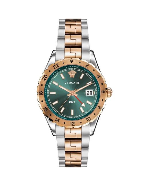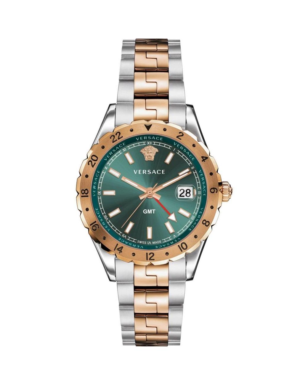 Scopri l'orologio da uomo Versace, un elegante accessorio che unisce funzionalità e lusso. Con un display analogico con funzioni data e Gmt, questo orologio svizzero vanta un quadrante verde, cassa in acciaio inossidabile da 42 mm nei toni argento e oro rosa, vetro zaffiro e un bracciale in acciaio inossidabile con chiusura a scomparsa. Resistente all'acqua fino a 5 bar, questo orologio è un'aggiunta senza tempo a qualsiasi collezione maschile.