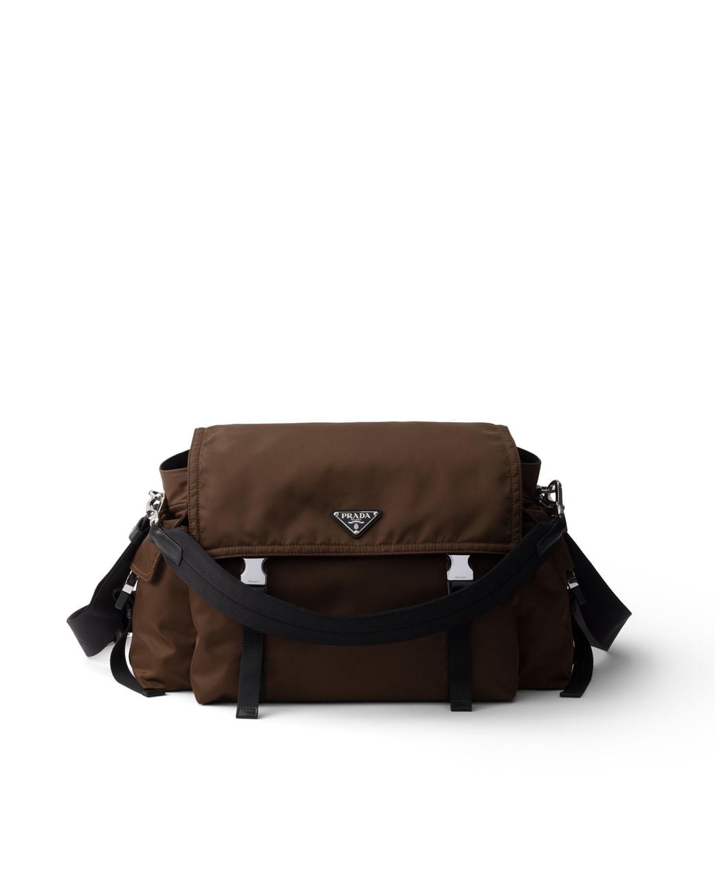 Manigliotto rimovibile in nastro nylon imbottito---Tracolla regolabile in nastro nylon. Lunghezza massima 140 cm - Lunghezza minima 74 cm - Luce massima 62 cm - Luce minima 32 cm---Logo triangolo in metallo smaltato su pattina---Chiusura con pattina e sistema a scatto e sotto zip---Quattro tasche esterne con zip, pattina e sistema a scatto---Interno con tasca zip---Fodera in Re-Nylon Colore: nero