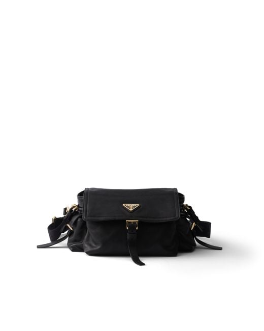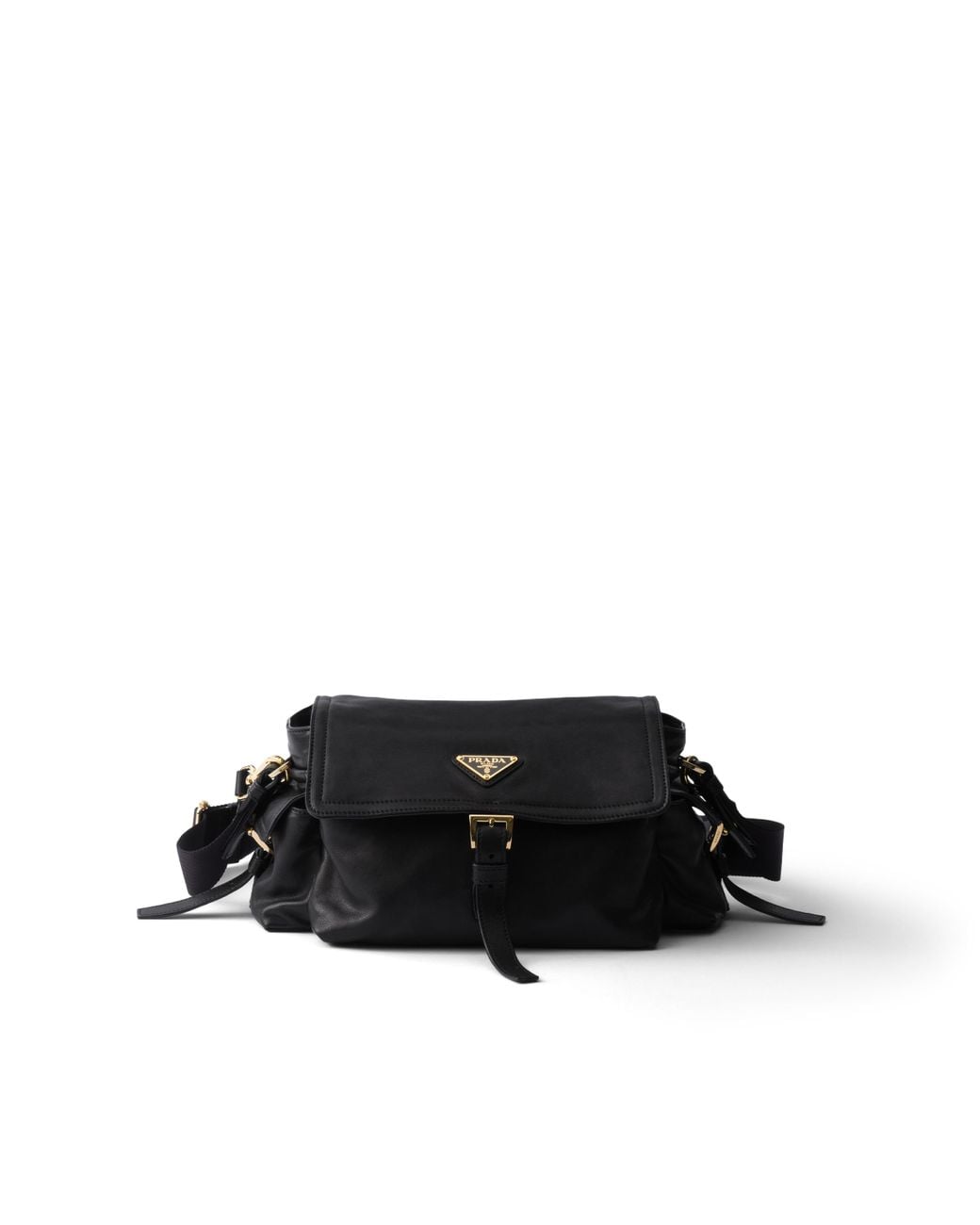 Manico in nappa, lunghezza 52 cm, luce 28 cm---Tracolla regolabile e rimovibile in nastro logato. Lunghezza massima 104 cm - Lunghezza minima 74 cm - Luce massima 50 cm- Luce minima 35 cm---Tasca frontale con zip---Tasche laterali con pattina---Finiture in metallo---Logo su triangolo in metallo smaltato sulla pattina---Chiusura zip, pattina e chiusura a fibbia---Interno in nylon siglato con tasca applicata Colore: nero