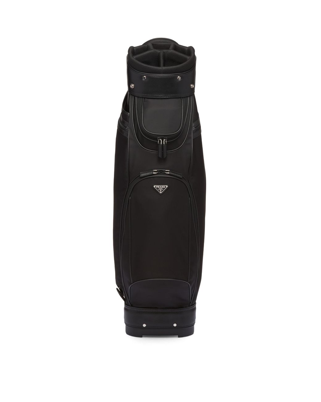 Bretella regolabile in nastro nylon e pelle---Logo triangolo in metallo smaltato su davanti---Sette tasche esterne con zip---Fodera Re-Nylon Colore: nero