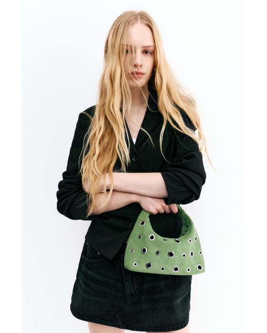 Borsa in tessuto effetto finta pelle, disponibile nel colore verde. Dettaglio di borchie. Manico corto con anelli. Chiusura con cerniera. Altezza x Larghezza x Profondità: 17.6 x 24 x 9.2 cm. Colore: verde