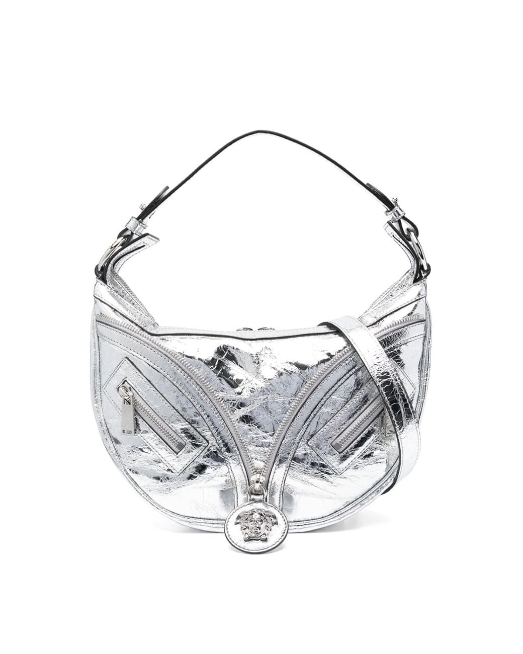 Piccola borsa a tracolla metallica «repeat» di Versace in pelle di agnello con finitura stropicciata, finitura metallizzata, motivo testa di medusa, ciondolo decorativo con cerniera, dettagli decorativi con cerniera, tasche frontali, chiusura frontale con zip, tracolla regolabile, scomparto principale e tasca interna con chiusura a zip, profondità del manico in centimetri, altezza, cinturino regolabile, scomparto principale e tasca interna con chiusura a zip, profondità del manico in centimetri, altezza, cinturino in centimetri, larghezza centimetri Colore: bianco
