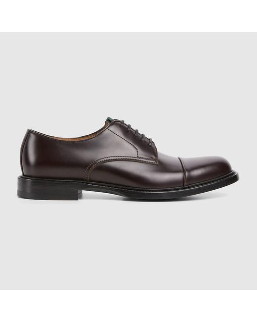 L'abbigliamento formale continua a essere rivisitato in perfetto stile Gucci stagione dopo stagione. Questa scarpa dal design minimal è realizzata in pelle marrone scuro e completata da una suola in pelle. Pelle lucida marrone scuro, Suola in pelle, Chiusura stringata, Altezza: 15 mm, Made in Italy Colore: marrone