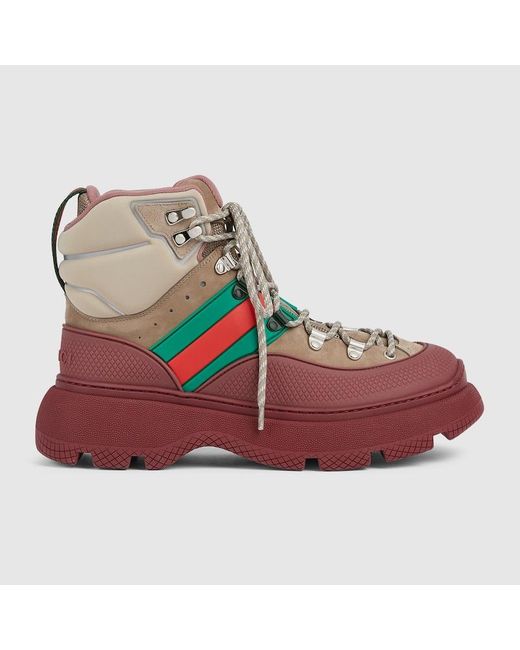 Ispirato ai modelli da escursionismo, questo stivale stringato da uomo combina funzionalità e stile distintivo. Realizzato in pelle scamosciata GG e foderato in soffice lana merinos, il design è una reinterpretazione unica ed esclusiva dell'abbigliamento outdoor. Pelle scamosciata marrone chiaro e bordeaux, Nastro Web in gomma verde e rosso, Suola a carrarmato in gomma, Modello stringato, Made in Italy Colore: neutro