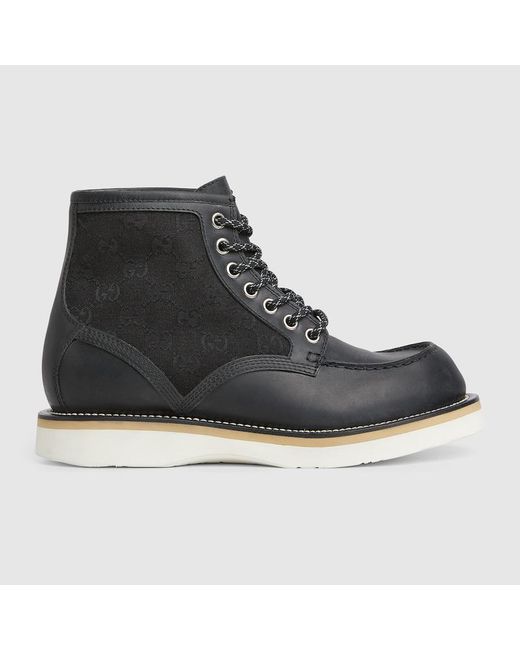 Combinando una silhouette classica con gli elementi distintivi di Gucci, questo stivaletto stringato da uomo presenta un inserto in tessuto GG in omaggio alla tradizione della Maison. Realizzato con una costruzione Goodyear, che garantisce una struttura resistente e migliora la durata della calzatura, questo modello coniuga tradizione e innovazione. Pelle nera, Inserto in tessuto GG, Suola in gomma, Costruzione Goodyear, Chiusura stringata, Altezza: 10 mm, Made in Italy Colore: nero