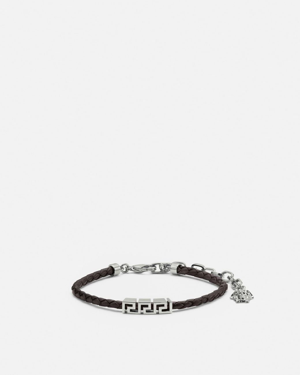 Bracciale in pelle di vitello intrecciata con accessorio Greca scorrevole. Tutti i gioielli firmati Versace sono privi di piombo e nichel. Tutti i materiali sono ipoallergenici. Colore: bianco