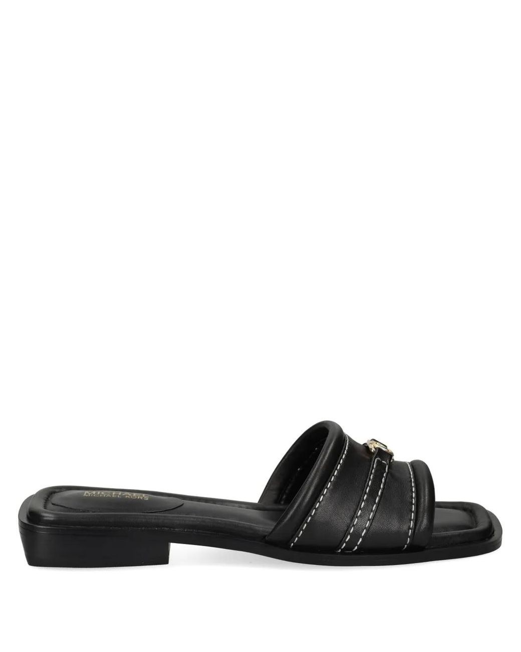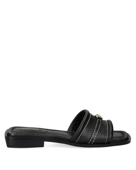 ブラック スクエアトゥ オープントゥ ローヒール ゴールドトーンのロゴプレート Size: 6. Gender: Female. Material:レザー.