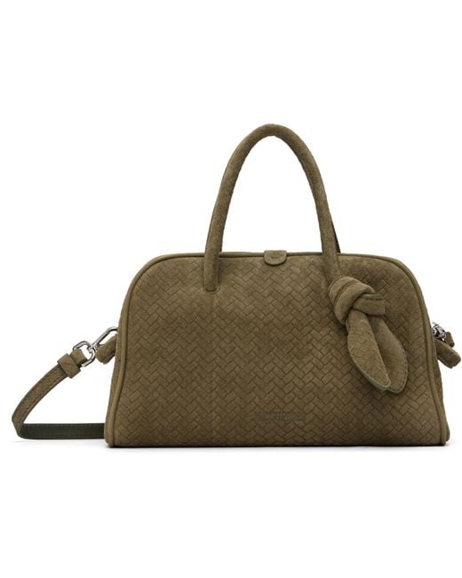 カーフスエードのトップハンドル バッグ。 ・ヘリンボーン柄と型押し ・ロール キャリーハンドル ・長さの調節と取り外しができるクロスボディ ストラップ ・ハンドルの付け根部分にノットのアクセント ・前面に型押しロゴ ・両サイドにストラップ ・開口部にダブルジップ ・内側にカード入れ ・ツイルの裏地 ・15cm x 25.5cm x 10cm サプライヤーカラー:Khaki カラー: グリーン