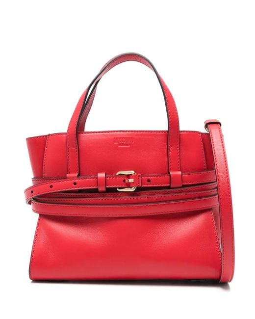 レッド カーフレザー バックル留め ダブルベルトディテール トップハンドル トップにファスナー Size: ワンサイズ. Gender: Female. Material:カーフレザー.