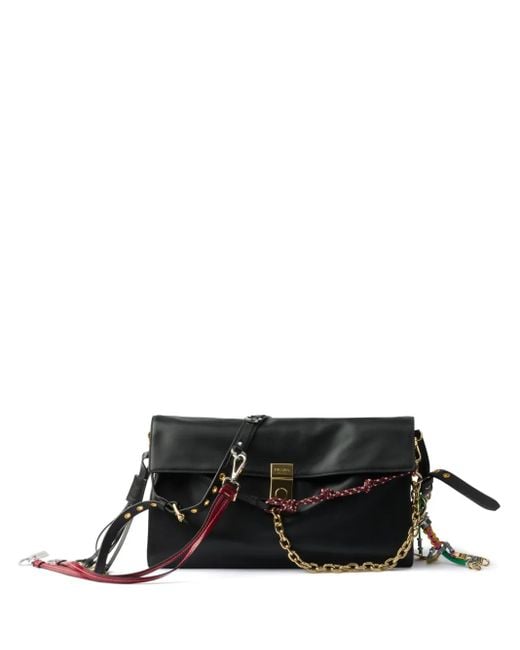 ブラック レザー スムースグレインレザー プッシュロック式開閉 取り外し&調節可能なショルダーストラップ ストラップディテール チェーンディテール タッセルディテール セパレートコンパートメント 内側にジップポケット 内側にロゴパッチ 総裏地 Size: OS. Gender: Female. Material:レザー.