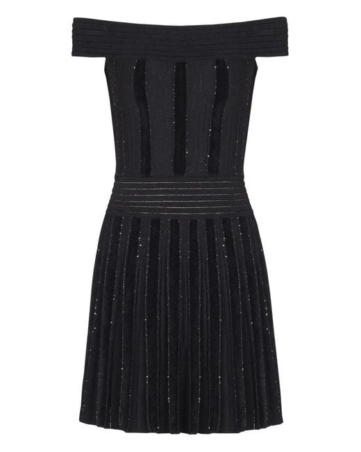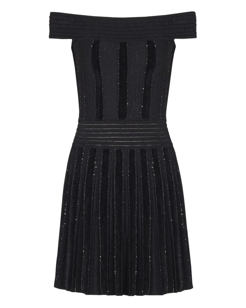 ブラック グリッターディテール ニット オフショルダーネックライン ファスナー プリーツスカート Size: 36. Gender: Female. Material:ビスコース/ポリエステル/ポリアミド. カラー: ブラック
