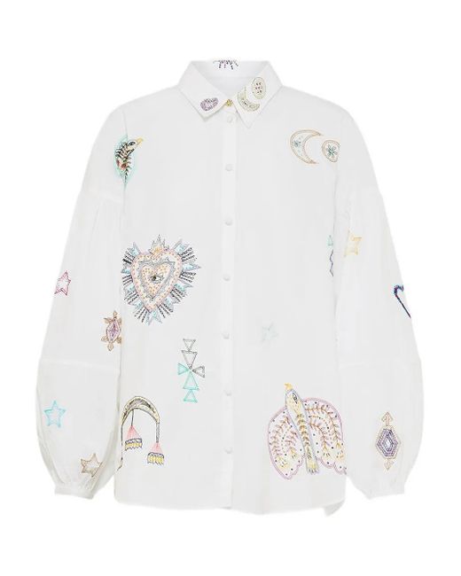 ホワイト 装飾 ボタン留め バルーンスリーブ ポインテッドカラー グラフィックプリント Size: M. Gender: Female. Material:オーガニック コットン. カラー: ホワイト