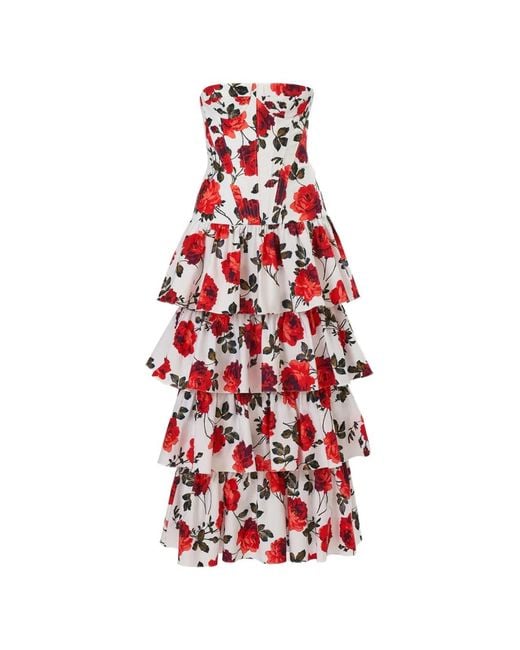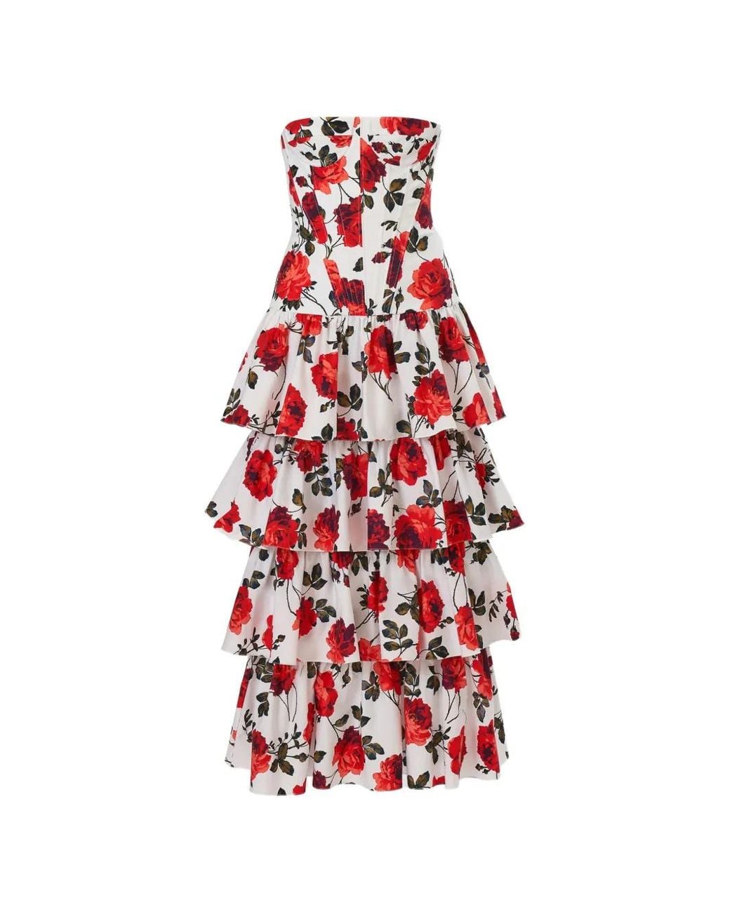 ストレッチコットンを使用したミディドレス。フィット感のあるコルセットボディスにロマンティックなティアードラッフルを組み合わせた、コントラスが際立つデザインが魅力です。マドリードの情熱にオマージュを捧げた、レッドローズプリントが施されています。 ランウェイスタイル 背面にジップクロージャー Size: 2. Gender: Female. Material:コットン/ポリウレタン. カラー: レッド