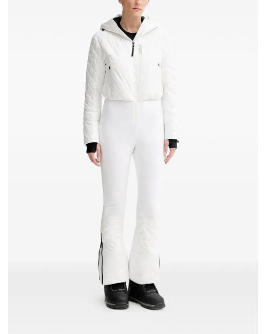 レディース ホワイト キルティング フーデッド スキースーツ