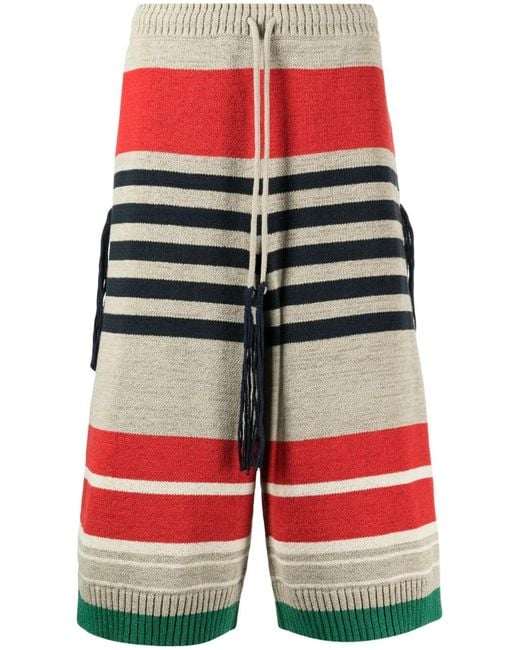 メンズ レッド ストライプ リブニット ショートパンツ