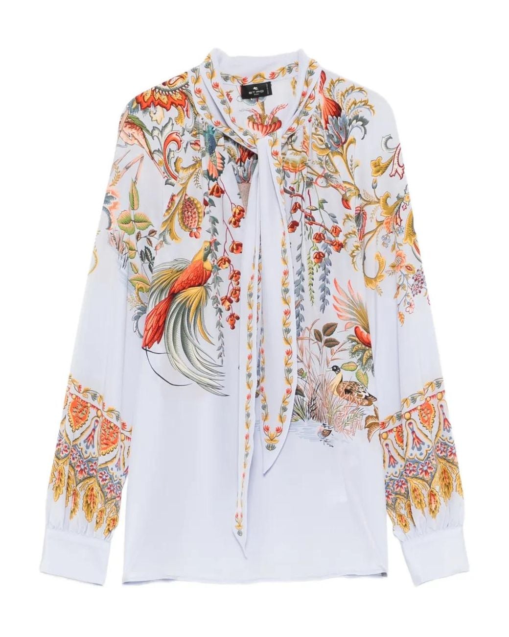 ライトブルー フローラルプリント バードモチーフ タイネック ロングスリーブ 袖口にボタン留め Size: 38. Gender: Female. Material:シルク. カラー: ホワイト