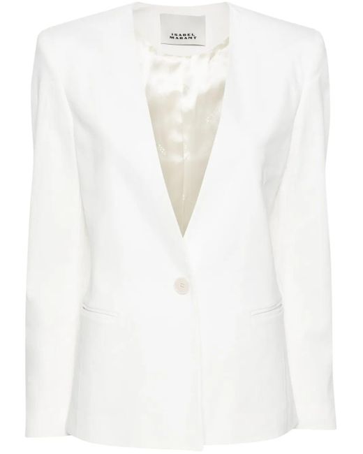 ホワイト ツイル ノーカラー Vネック ショルダーパッド ロングスリーブ 袖口にボタン留め フロントにダブルパイピングポケット x 2 ロゴジャカードの裏地 ストレートな裾 フロントにボタン留め Size: 38. Gender: Female. Material:ポリウレタン/ヘンプ/ビスコース/ビスコース/コットン.