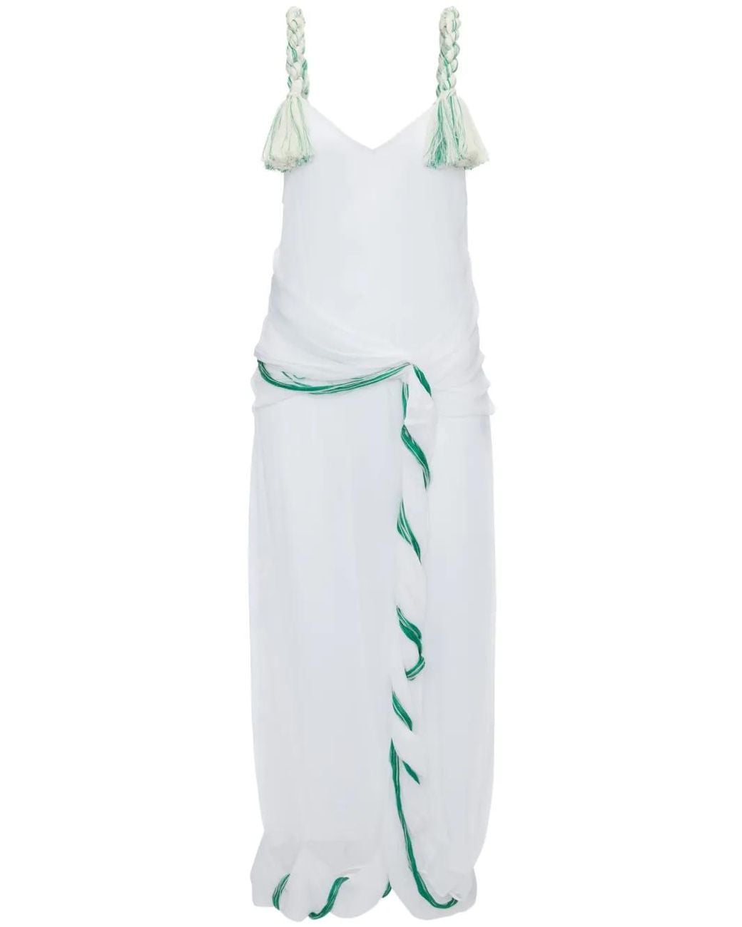 ホワイト クレポン シワ加工 タッセルディテール ツイストディテール Vネック ブレード編みショルダーストラップ x 2 ドレープディテール バックVスリット アシンメトリードレープヘム Size: 10. Gender: Female. Material:ビスコース.