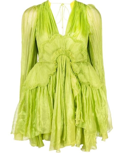 ライムグリーン、シルク、Vネック、ラッフルディテール、クロップドパフスリーブ、バックに結び留め、ティアードスカート、ひざ上丈。 Size: 42. Gender: Female. Material:シルク/ナイロン/ポリウレタン.