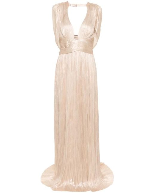 ベージュ チュール デザイン ホイル転写仕上げ プリーツ加工 ケープデザイン プランジVネック シンチウエスト フロントにスリット バックにカットアウトディテール ストレートな裾 総裏地 バックにリボン&ジップ開閉 Size: 38. Gender: Female. Material:ナイロン/シルク/スパンデックス.