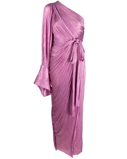 オーキッドパープル、シルク、メタリックファブリック、プリーツ加工、ノットディテール、フレアカフス、フィットウエスト、サイドスリット。 Size: 34. Gender: Female. Material:シルク/ナイロン/スパンデックス.