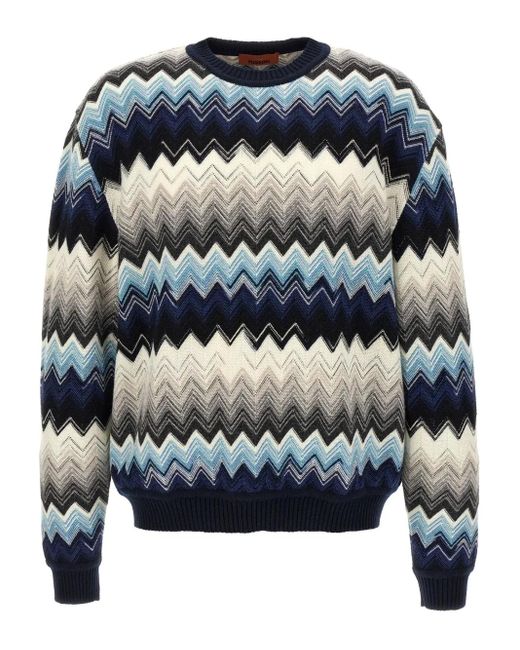 ブルー ウール&コットンブレンド シェブロンデザイン クルーネック ロングスリーブ、カフス リブ編みの裾 こちらのMissoniの商品は職人によるハンドメイドのため、 実際の商品が写真と若干異なる場合がございます。 Size: 50. Gender: Male. Material:ウール/コットン.
