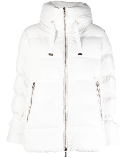 ホワイト、フェザーダウン、パデッドデザイン、キルティング、ロゴの刻印入りゴールドトーンの金具、ファンネルネック、フロントに2wayジップ式開閉、ロングスリーブ、サイドにジップポケット x 2、ストレートな裾。 Size: 38. Gender: Female. Material:ポリエステル.