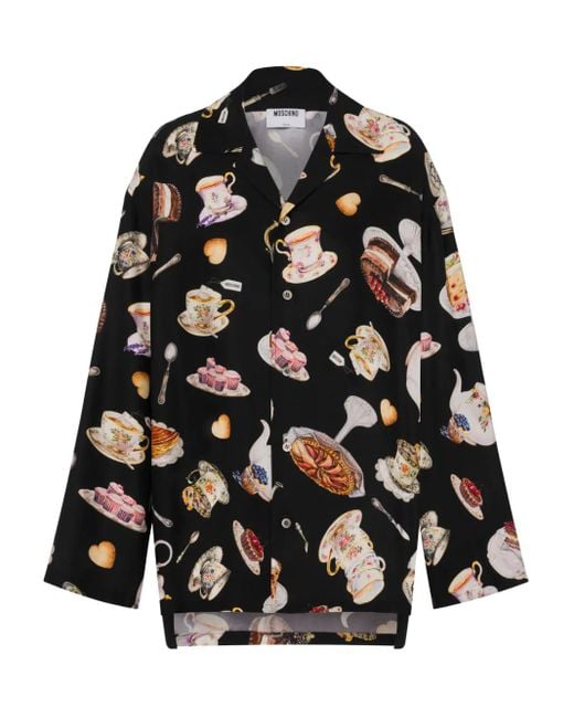 ブラック ティーカップ&デザートプリント ノッチドカラー ロングスリーブ ボタン留め リラックスフィット Size: 36. Gender: Female. Material:シルク.