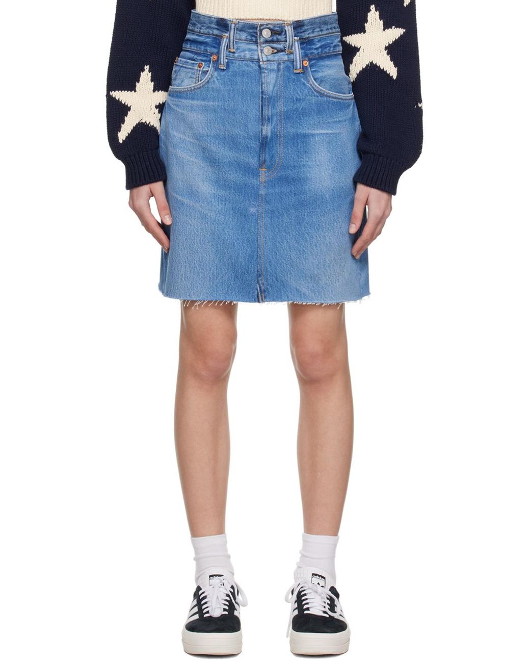 ノンストレッチデニムのスカート。ヒゲ加工とダメージ加工。色褪せ感のある仕上げ。 ・ハイウエスト ・変形型のウエストにベルトループ ・5ポケットスタイル ・ボタンフライ ・裾はカットオフ ・背面にレザーのロゴパッチとテキスタイルのロゴタグ ・背面にセンタースリット サプライヤーカラー:Indigo カラー: ブルー
