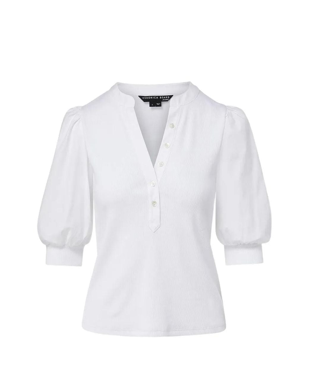 ホワイト リブ編み Vネック ボタン留め バルーンショートスリーブ Size: XS. Gender: Female. Material:コットン/ポリウレタン. カラー: ホワイト