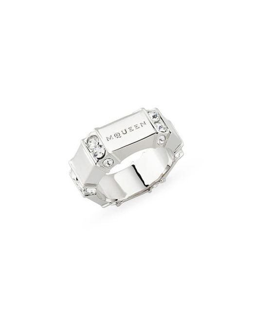 A faceted silhouette enhances the light-catching power of this crystal-detailed ring centered by logo engraving. Color: white