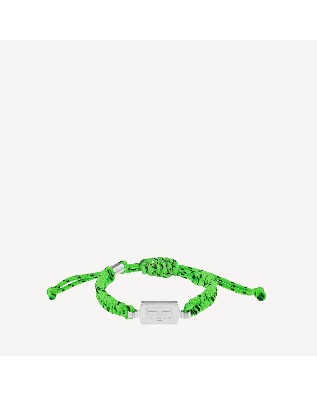 Saint-germain lace bracelet in neon green and black polyester and shiny silver brass. • brass and polyester• bracelet• plate with bb icon logo engraved• bicolor braided design• adjustable sliding knots• made in italy• this item is nickel-free, lead-free, and hypoallergenic. 70% brass, 30% polyester. Color: green