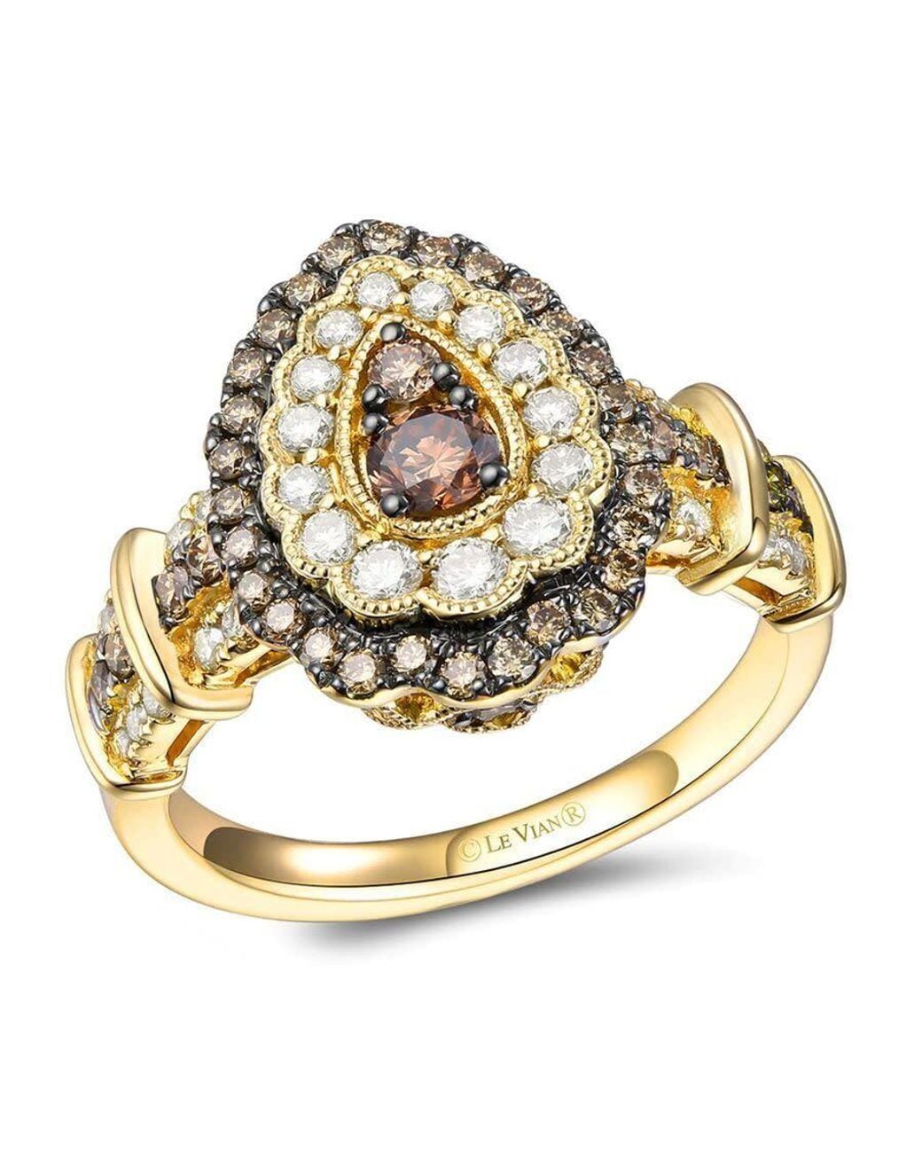 Le Vian Ring featuring 3/8 cts. Chocolate Diamonds , 5/8 cts. Nude Diamonds set in 14K Strawberry Gold Le Vian Ladies Rings. Chocolate Diamonds series. SKU: TSCE 30BYG. Barcode: 191247977283. Color: Yellow. Metal Type: Yellow Gold. Metal Stamp: 14k. Metal Weight: 4.995g. Gem stone type: Diamond. Stone weight: 0.18ct. Number of stones: 78. Stone shape: Round. Stone color: Brown. Ring style: Cocktail. Le Vian Ladies Chocolate Diamonds Rings set in 14K Strawberry Gold.