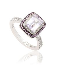 Go to ShopSimonDiscover the elegance of the Suzy Levian Sterling Silver Purple Amethyst Cushion Cut Ring. This stunning piece features a large purple amethyst center stone surrounded by a halo of white topaz and pink