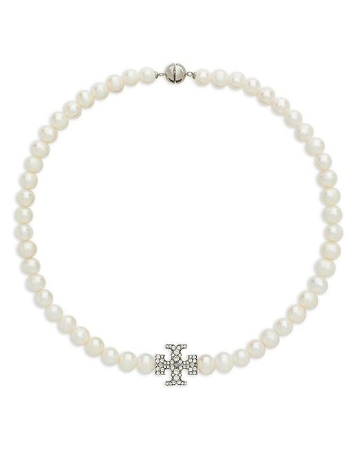 Women's White Kira Pave Double T & Cultured Freshwater Pearl Collar Necklace, 16.3