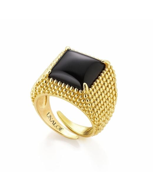 A bold accessory that doesn’t go unnoticed: the Unaloe women’s ring is crafted in 925 sterling silver with an 18kt gold plating and an elegant beaded texture. The black onyx at the center adds a touch of mystery and refinement, perfect for enhancing any outfit with style. The adjustable band makes it easy to fit on different fingers. We recommend starting from your usual size and slightly adjusting it for an ideal fit—tighten or loosen it to your preference. Perfect for those who love bold, modern jewelry without compromising on the elegance of Made in Italy. Each piece is handmade using the traditional lost-wax casting method. Onyx, with its deep and captivating allure, embodies strength and elegance. This remarkable stone teaches us that within every challenge lies an opportunity to discover our inner resilience and depth. Onyx symbolizes power and transformation, reminding us that the greatest trials can yield the most invaluable treasures. Unaloe Jewelry pieces are crafted for durability and require minimal maintenance. To preserve their natural beauty, avoid exposing them to soaps, cosmetics, detergents, and chlorine, which could compromise the jewelry's integrity. When not in use, store your Unaloe piece in its protective bag to guard against natural oxidation. If cleaning is needed, gently polish the surface with a suede cloth. Embrace the captivating allure of Unaloe, designed to make you stand out. Each Unaloe Jewelry piece is handmade using the ancient lost wax casting technique, dating back to 3500 B. C., and crafted from 925 sterling silver entirely made in Italy. Slight variations in color or minor imperfections are a testament to the artisanal craftsmanship that makes each piece unique. Unaloe represents youthful, high-quality, and fashionable jewelry. With clean and refined lines, our pieces are both elegant and accessible, distinguished by the strong personality of Italian craftsmanship, a hallmark of quality and creativity. Stylish and versatile, Unaloe jewelry enhances your elegance and generosity, suitable for any occasion and easy to pair with various outfits. Unaloe makes an excellent gift for any special occasion, such as birthdays, graduations, anniversaries, weddings, Christmas, Easter, Valentine's Day, and Mother's Day. Every piece is nickel-free and fully compliant with the EU's Reach/Rohs directives, ensuring safety and quality. PROCESSING: Made in Italy - Quality Certification MATERIAL: Silver Sterling 925-ONYX SUSTAINABLE : Our company's goal is to be an environmentally friendly brand, aimed at an eco-sustainable future.