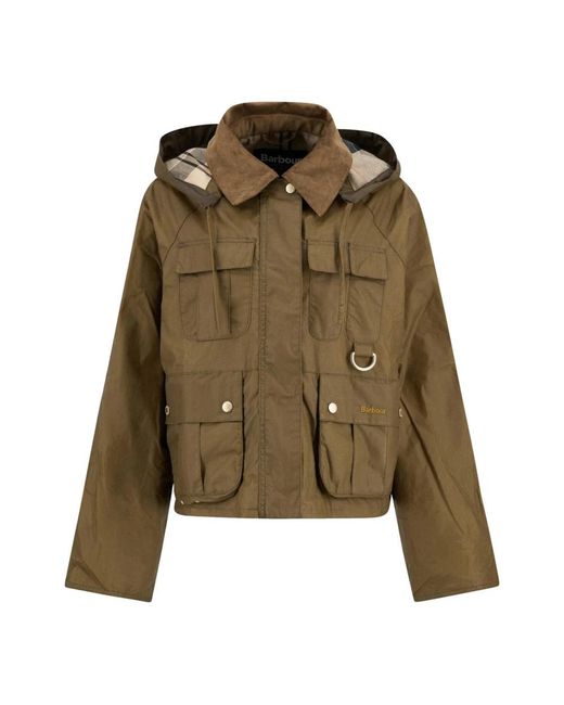 De Barbour Liza Waxed Jacket combineert een kort, op utility geïnspireerd silhouet met gewaxte katoenen bescherming voor dagelijks gebruik en buitenactiviteiten. Belangrijkste kenmerken: Beige scuro | Gewaxt katoen | Weerbestendig | | Meerdere utility zakken | Metalen D-ring op de borst | Afneembare capuchon | Elleboogstukken in bijpassende stof | Kort, op utility geïnspireerd silhouet | Tartan voering in de body, capuchon en omslag van de mouwen | Geïnspireerd op de Spey Jacket | Afmetingen en pasvorm: Korte lengte | Samenstelling en onderhoud: Buitenkant: 100% katoen (gewaxt) | Binnenkant: 65% polyester, 35% katoen | Alleen reinigen met een spons. Kleur: groen
