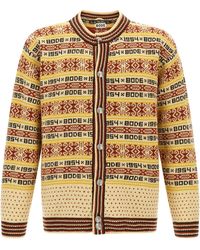 Ga naar BalardiPiratenschip' zwaar scheerwollen gebreid vest met inlegwerk van een piratenschip, een verwijzing naar J.M. Barrie's Jolly Roger en bloemen, overhemdkraag, knoopsluiting aan de voorkant, zakken, lange mouwen. BODE. Vestje 'Piratenschip'. Past qua maat. Kleur: naturel