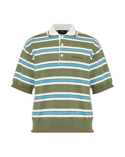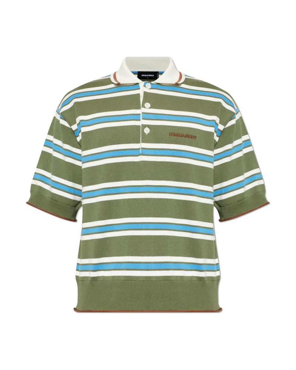 Dsquared 2 Polo Shirt gepresenteerd in een verfijnde groene tint, die een zachte gebreide textuur combineert met opvallende meerkleurige strepen en een geborduurd logo voor een verzorgde, alledaagse look. Belangrijkste kenmerken: Groen | Katoen | Zachte gebreide stof | Comfortabel om te dragen | Korte mouwen | Geribbelde boorden aan mouwen en zoom | Geborduurd logo op de borst | Regelmatige strepen in wit, blauw en bruin | Klassiek silhouet met korte mouwen | Subtiel gestructureerd breisel | Afmetingen & pasvorm: Lengte model: 185 cm | Borstomvang model: 92 cm | Taille model: 74 cm | Heupomvang model: 91 cm | Model draagt maat: L | Ietwat losse pasvorm | Samenstelling & onderhoud: Katoen Kleur: groen