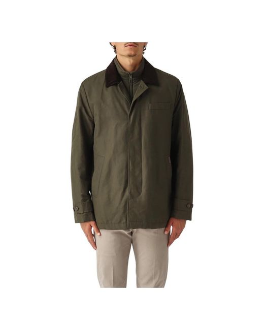 Fay Morning Regenjas is een korte regenjas met dubbele voorkant, ontworpen om in lagen te dragen bij nat weer. Het combineert een waterafstotende katoen- en nylon faille buitenkant met een fluwelen kraag en gewatteerde voering voor praktische, stijlvolle bescherming. Belangrijkste kenmerken: Groen | Verde | Katoen en nylon | Waterafstotende afwerking | Geïsoleerde vulling | Rits- en blinde knoopsluiting | Zijzakken met paspel | Binnenzak | Toggles aan de manchetten | Fluwelen kraag | Dubbel ontwerp aan de voorkant | Geruit voering | Leren logo label | Korte lengte | Afmetingen & pasvorm: Regular fit | Samenstelling & verzorging: 61% Katoen, 39% Polyamide (buitenkant) | Voering: 65% Polyester, 35% Viscose | Mouwvoering: 100% Polyamide | Vulling: 100% Polyester | Alleen chemisch reinigen. Kleur: groen