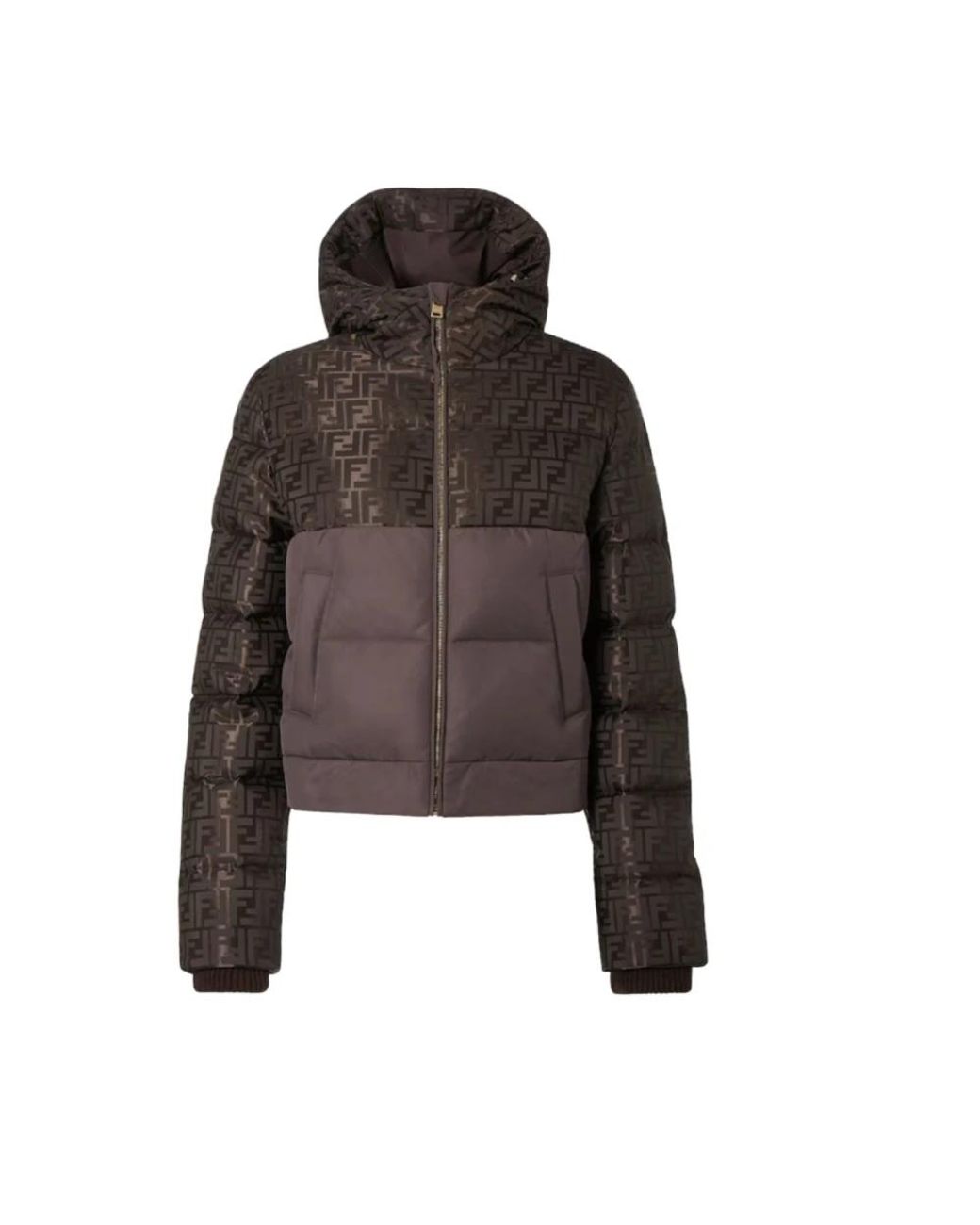 Profiteer van de beste deals! De Fendi donzen jas is een korte, gewatteerde jas, vervaardigd van glanzend FF jacquard nylon, ontworpen om geïsoleerde warmte te leveren met een kenmerkende luxe afwerking. Hij combineert een hoge kraag en capuchon met een compact, stadsklaar silhouet voor koud weer. Belangrijkste kenmerken: Bruin | Dunkelbraun | Nylon | Gewatteerd | Donzen isolatie | Hoge kraag | Verstelbare capuchon met trekkoord | Diagonale zakken | Ritssluiting aan de voorkant | Gebreide manchetten voor extra afsluiting | Kort silhouet | Glanzend FF jacquard nylon met iconisch FF-motief | Centraal inzetstuk van mat nylon | Metaalbeslag met palladium afwerking | Gebreide manchetten | Samenstelling & verzorging: Shell: 64% katoen, 36% polyamide | Centraal inzetstuk: 100% polyamide | Coating: 100% polyurethaan hars | Trim: 100% wol | Voering: 100% polyester | Vulling: 90% dons, 10% eendenveren | Raadpleeg de wasvoorschriften van de fabrikant. Kleur: bruin