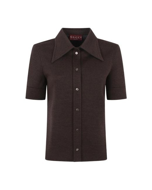 Profiteer van de beste deals! Gucci Wollen Katoenen Jersey Shirt, een combinatie van een zachte wol-katoenmix en een strak silhouet met knoopsluiting. Ontworpen voor veelzijdig gebruik, geschikt voor zowel casual als formelere looks. Belangrijkste kenmerken: Donkerbruin | Wol-katoen jersey | Knoopsluiting aan de voorkant | Lange puntkraag | Korte mouwen | Interlocking G-borduursel | Afmetingen & pasvorm: Stijlvolle pasvorm | Samenstelling & verzorging: 50% Wol | 47% Katoen | 3% Polyamide | Alleen chemisch reinigen Kleur: zwart