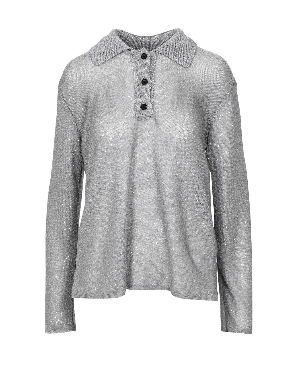 Lurex Yarn - All -Over Appliqué Micro -pailletten - Lange mouwen met gevallen schouder - Klassieke gebreide polo -kraag - Knop Voorafsluiting - Regelmatige pasvorm - Made in Italië. Kleur: grijs