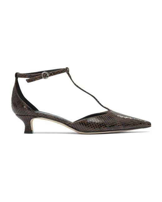 De Aeyde Liz T-Bar Pumps vernieuwen een klassiek silhouet met kalfsleer met slangenprint en een gevormde kittenhak. Ze zijn geschikt voor elegante gelegenheden en verfijnde alledaagse looks, waarbij verfijnde details worden gecombineerd met een comfortabele lamshuid voering. Belangrijkste kenmerken: Moka | Kalfsleer | Lamshuid voering | Nubuck zool met rubber injecties | Verstelbare gespsluiting bij de enkel | Band over de wreef | Beklede hakconstructie | Slangenprint reliëf | Puntige neus | T-bar band | Rode stiksel op de hielkap | Beklede kittenhak | Afmetingen & pasvorm: Hakhoogte: 3,81 cm | Europese maatvoering; raadpleeg de maattabel van het merk | Samenstelling & verzorging: Bovenkant: Kalfsleer | Voering: Lamshuid | Buitenzool: Leer, rubber