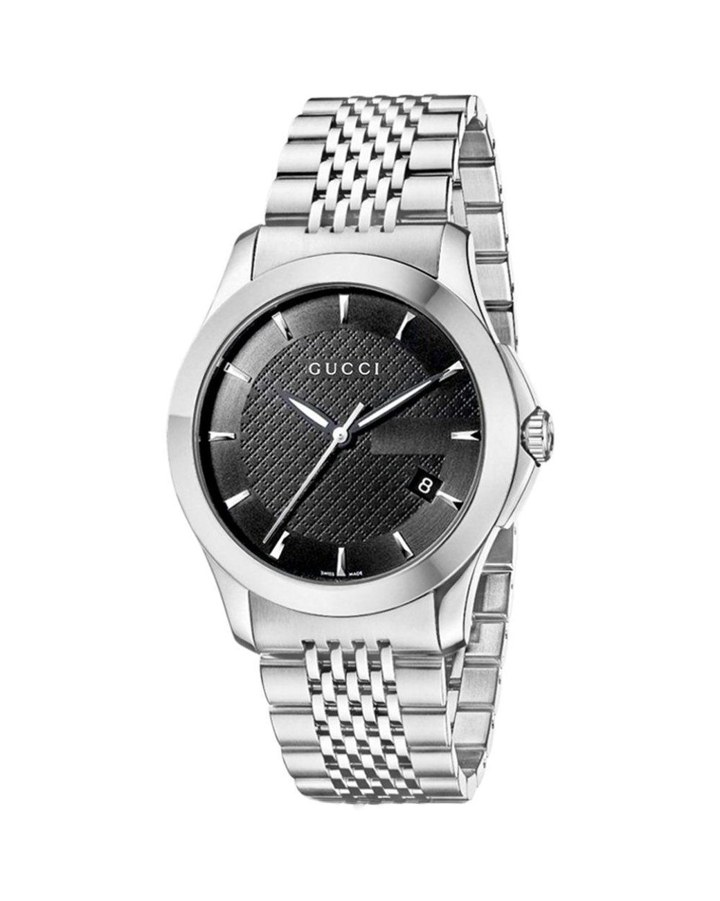 Onderdeelnummer fabrikant: YA126402EAN: 0731903240261Beweging: QuartzArmband kleur: ZilverWaterdichtheid: 30M (3ATM)Kleur wijzerplaat: ZwartArmband materiaal: Roestvrij staalDatum: JaMaat diameter: 40mmMaat dikte: 9mm Geslacht: MannenDisplay: AnaloogCollectie: Gucci TijdloosGlas type: Anti-reflecterende saffier