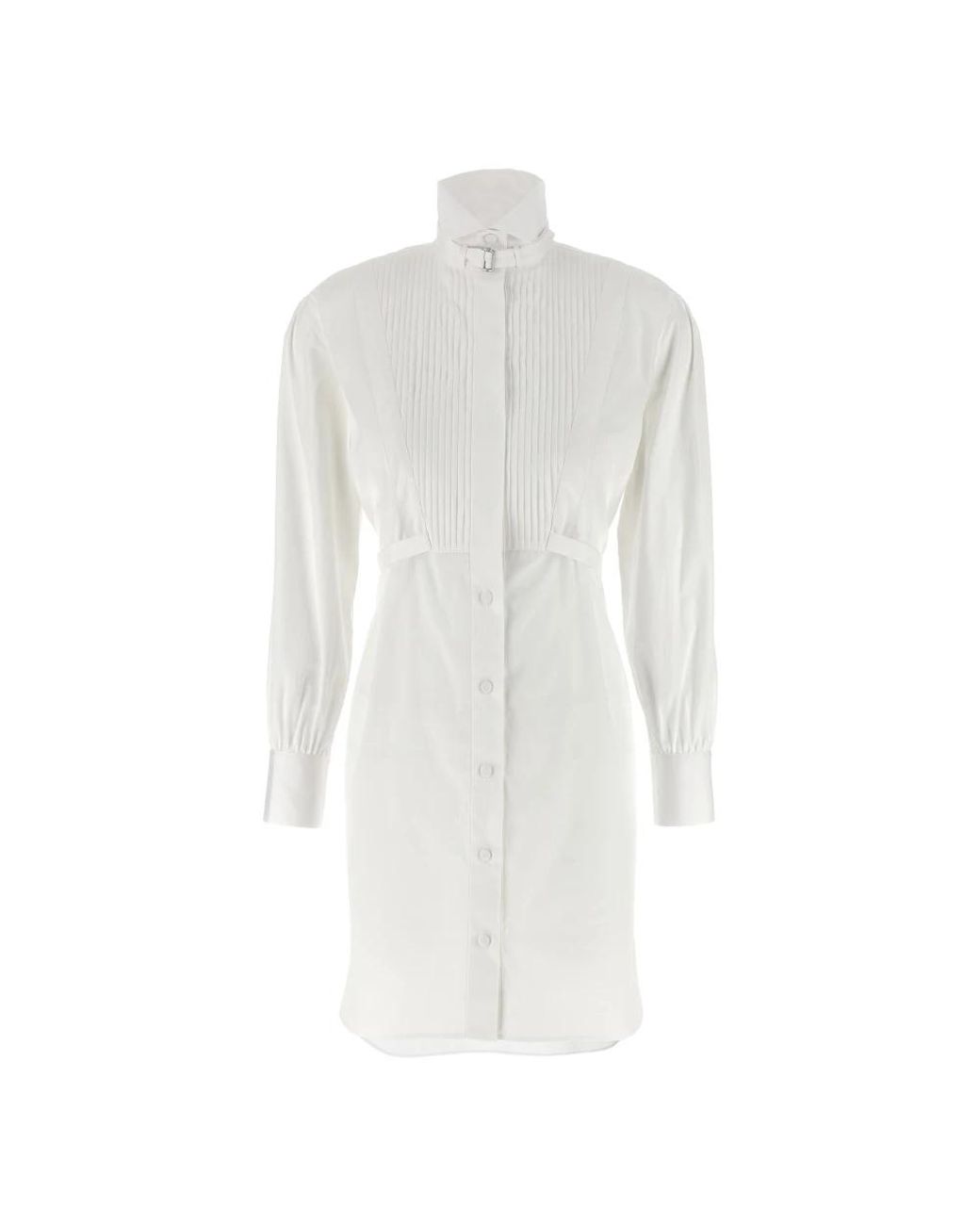De Alexander Mc Queen Tuxedo Chemisier Jurk is een overhemdjurk van katoenpopeline, gekenmerkt door een geplisseerd plastron en een opstaande kraag met een verstelbaar riempje. Hij is ontworpen voor een verzorgde daglook met een ceintuur in de taille en een verfijnd silhouet van een overhemdjurk. Belangrijkste kenmerken: Wit | Katoen | Verstelbaar kraagbandje | Knoopsluiting aan de voorkant | Taille riem | Lange mouwen met manchet | Zijsplitten | Geplisseerd plastron | Opstaande kraag | Verlaagde schouder | Silhouet van een overhemdjurk | Afmetingen & pasvorm: Oversized pasvorm | Samenstelling & verzorging: 100% katoen Kleur: wit
