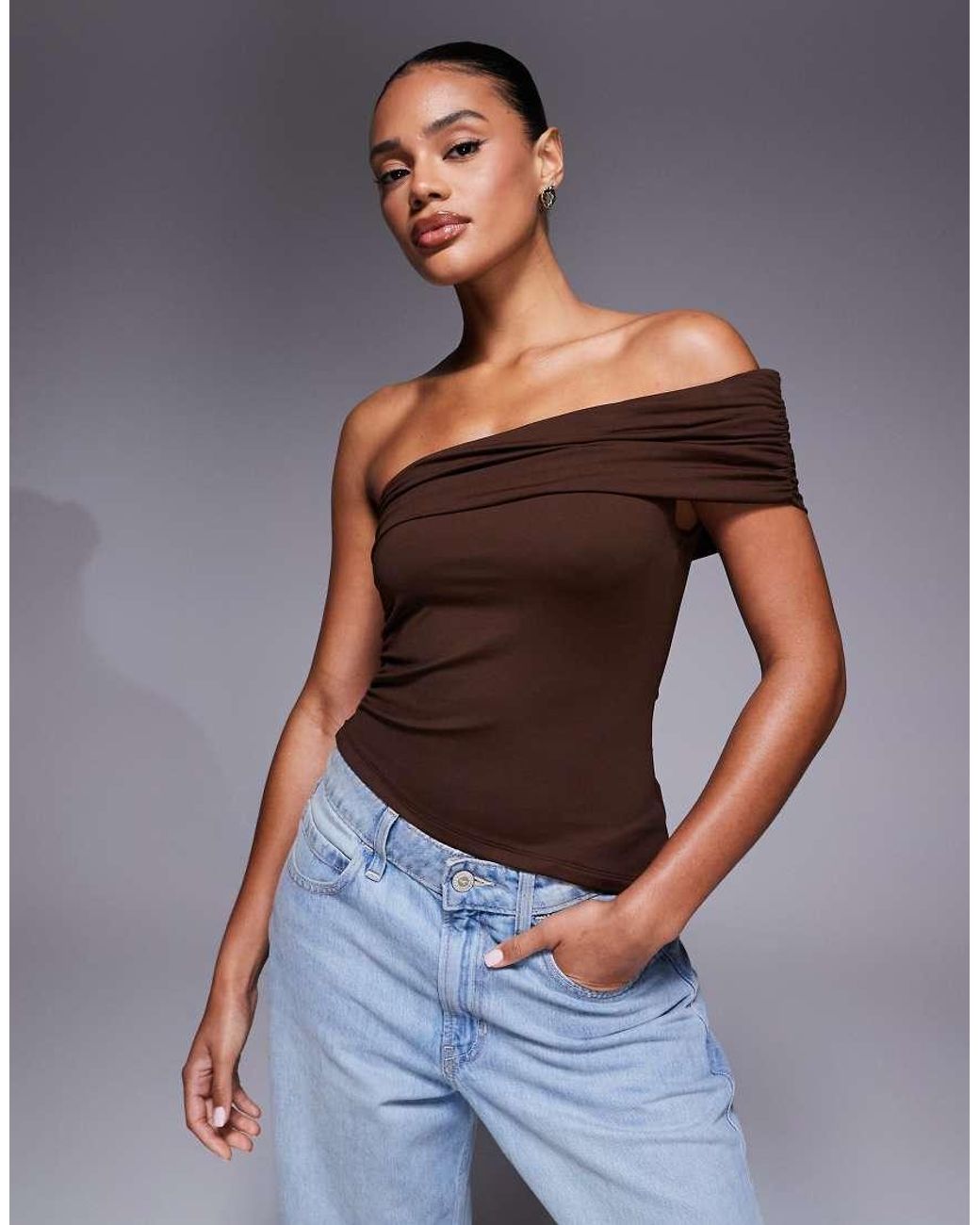 Asymmetrische Top Van Glad Polyamide Met Blote Gedrapeerde Schouder - Bruin