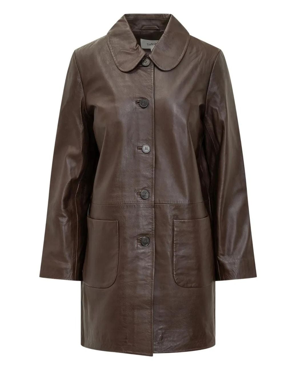 BruinRonde kraag knoopsluiting vier opgestikte voorzakken lange mouwen gesmockt detail aan de achterkant Size: 0. Gender: Female. Material:Lamsleer. Kleur: bruin