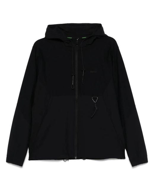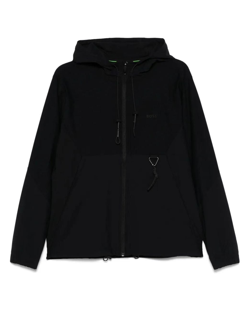 Zwart ritssluiting aan de voorkant twee steekzakken aan de zijkant karabijnhaak capuchon met trekkoordsluiting Size: M. Gender: Male. Material:gerecycled polyamide/Elastane. Kleur: zwart