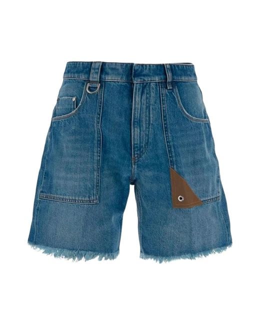 Fendi Denim Bermudas in gewassen donkerblauw denim, afgewerkt met logo-klinknagels en een diagonaal suède detail op de voorzak voor een verfijnde casual look. Het ontwerp combineert een vijfzakkenmodel met decoratieve metalen accenten voor dagelijks gebruik. Belangrijkste kenmerken: Blauw | Donkerblauw | Katoen | Vijfzakkenmodel | Riemlussen | Verborgen ritssluiting | Metalen ring aan riemlus | Gewassen afwerking | Diagonaal suède detail op de voorzak | Logo-klinknagels | Rafelzoom | Jacquard patch op achterzak | Samenstelling & verzorging: 100% Katoen | Handwas Kleur: blauw